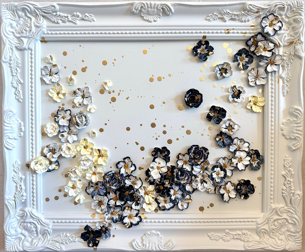 When abstraction and realism collide, Christina Akerson transforms the natural world through her unique artistic lens. Her work captures both chaos and tranquility, reflecting the intricate balance found in nature. Akerson’s 3D Floral Series offers a modern reimagining of traditional floral imagery. Each petal is hand-sculpted on a spinning nail head, crafted from a blend of acrylic paint and marble dust, and left to dry for weeks. After thousands of individually made petals are formed, they emerge as intricate flowers, assembled into compositions as lush as a bouquet and as immersive as a wild field. Flowers have long symbolized love, peace, forgiveness, and sympathy, and Akerson’s work celebrates their profound cultural significance in a bold, contemporary way.